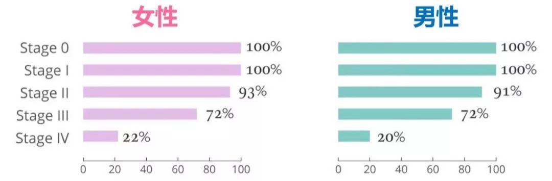 第一个是自我感觉,如果你感觉不好,“长期体力不支、容易疲劳、形容憔悴”,你就酸了。在座大家都笑,因为咱们的素养比较高一点。 第二个很有欺骗性,就说你要是不信,我就免费寄一个PH值试纸给你,连续三天早上起来测自己的唾液,如果低于7的话,你就是酸性体质。 这有没有什么问题呢?这里面偷换了一个概念,血液变成了唾液。唾液正常的PH值是多少呢?是6.8到7.1,所以你只要敢测,你就一定是酸性体质。很多人测完以后吓死了,说这么酸还没死真的是万幸,要赶快到淘宝上去买点什么东西才可以。 酸性体质是个很奇葩的理论,因为咱们中医没有这个理论,西医也没有这个理论,那为什么它会出现呢?所有的网络平台上,你可以去搜索下排酸产品,感受一下。 为什么我们这些辟谣的人总是辟不过那些传播谣言的人呢?因为我们是兼职在辟谣,别人是全职在传播伪科学,别人每天早上起来的第一件事就在想怎么能把这个伪科学传播出去,我们怎么搞得过他们? 第四个谣言我觉得也很重要,就是饿死癌细胞。它的理论是说癌细胞生长很快,特别爱吃糖,所以咱们就不要吃东西,饿死它。 这个东西想起来好像是靠谱的,但有个问题,癌细胞喜欢吃糖,但很多细胞也爱吃糖,比如说我们的脑神经细胞,我们的免疫细胞,所以通常来说在饿死癌细胞之前,你已经把人饿死了。 这就像大家说我们每个月工资太少,税收得太多了,你觉得你应该采用的办法是多发钱,还是少发工资呢?你还不如多发点钱大家都过得好一点就行了。 在中国20%到30%的患者最后是被饿死的,真的,不开玩笑。在美国现在营养支持是非常重要的治疗中的一个整体的环节,中国这方面现在还非常地落后。但是很有幸地,有些专家已经开始呼吁,我们会在这方面做得更多一些。希望大家以后也不要盲目地相信饿死癌细胞这件事情,癌症病人真的更要吃好吃饱。 刚才讲到的很多都是治疗方面的东西,但其实我永远都要强调的是,预防大于筛查,大于治疗。预防是上策,筛查是中策,治疗是下策,我们都希望能防患于未然。 先讲讲筛查,为什么筛查这么重要呢?癌症发现得早的话,其实通常都是不致命的。这是美国的五年癌症生存率,大家可以看到零期、一期、二期的癌症存活率是非常高的,即使到三期也是很不错的。但是到了四期,当它广泛转移以后就比较困难了,所以如果能通过筛查早点发现就会好很多。