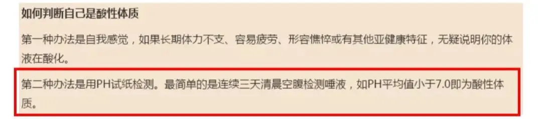 第一,正常的血液PH值都是7.35到7.45。这个有没有问题?没有问题,所有的伪科学第一句话都是科学的。 第二个是我们的PH值如果小于7就会死。这句话也没有问题。但如果做过体检的话,你仔细去看你的血液检查表,里面有PH值这一项吗?没有,因为测也白测,都是7.35到7.45这么高。 但是他就跟你说,如果你的身体不行了,你从健康到亚健康就是酸了,到疾病到死亡就是酸+、酸++,越酸就死得越快,然后有人就问,怎么判断自己酸了没有呢?他说有两个办法,不要着急。这是伪科学的一贯办法,非常强。