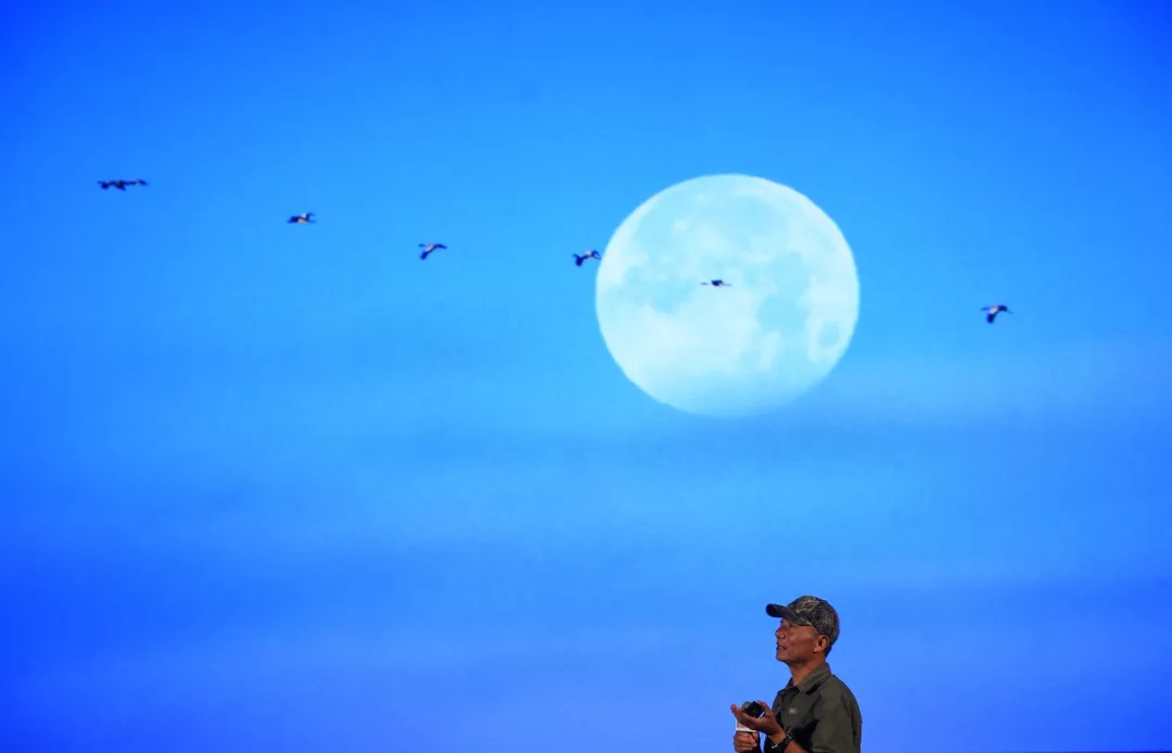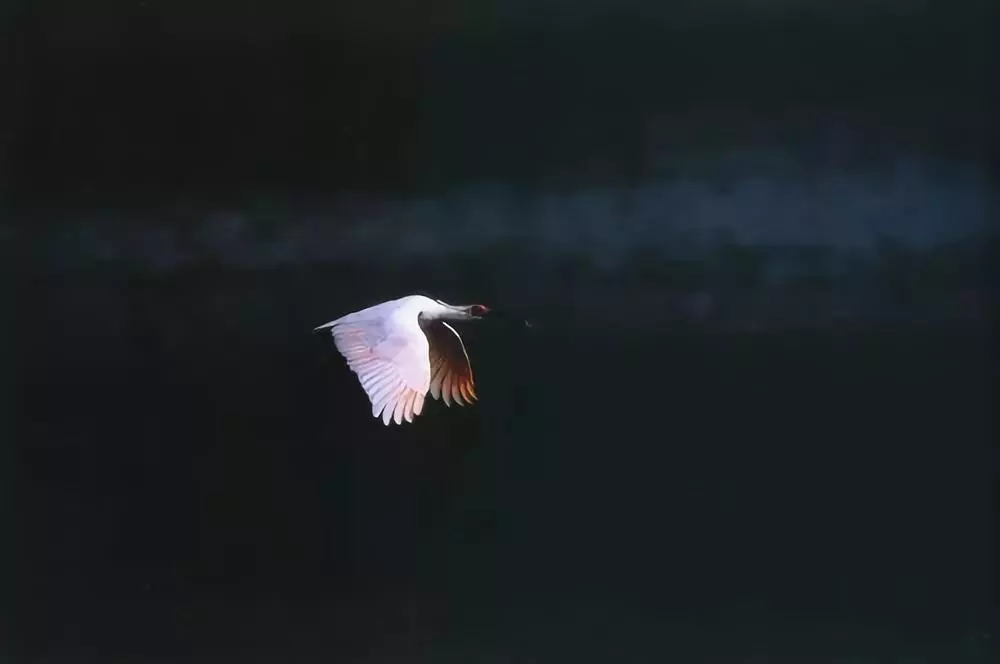 他拍到了国家一级保护动物朱鹮,雪白的翅膀挥动在昏暗的天空之上。