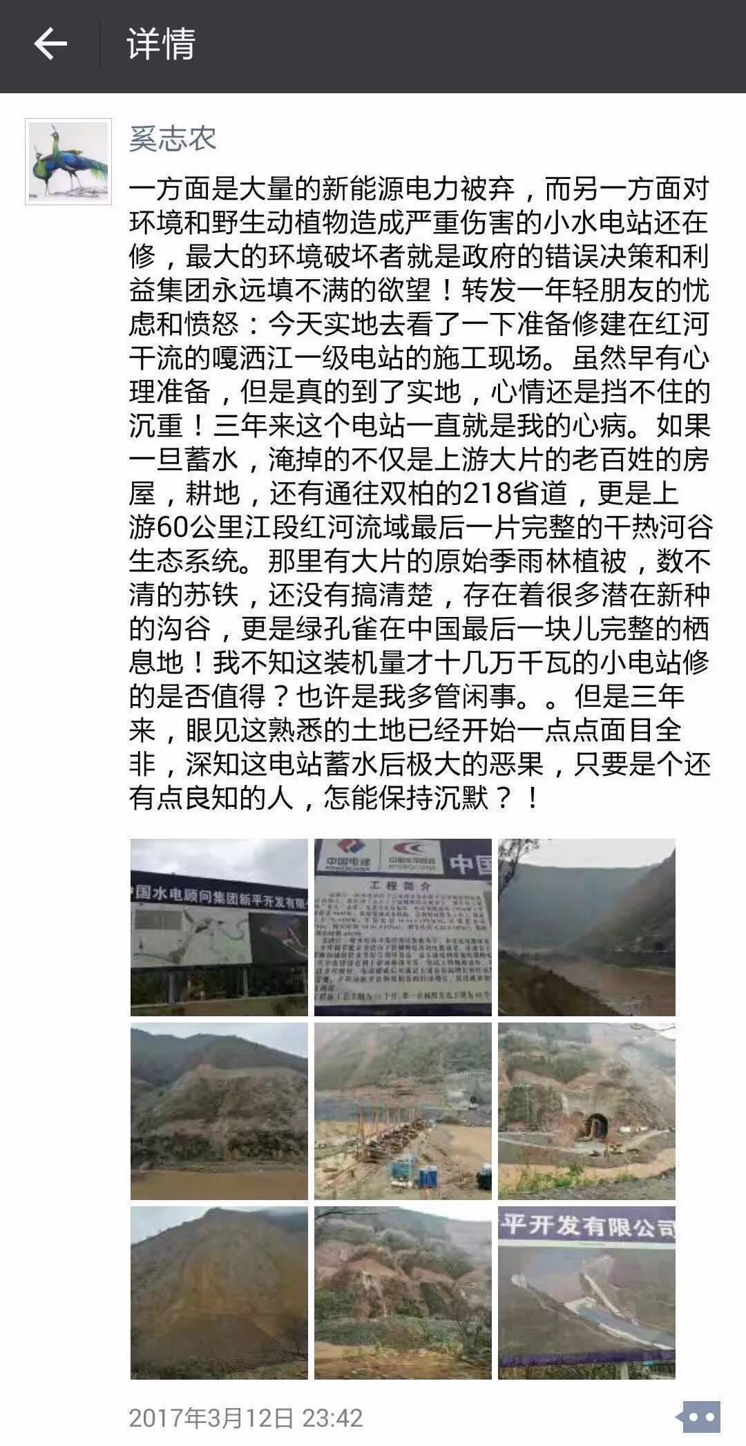 为了能够阻止水电站的建设,野性中国深入保护区做调研提方案,《谁在“杀死”绿孔雀?中国最后一片绿孔雀完整栖息地即将消失》、《为绿孔雀留下最后的家园》……奚志农更是连夜前往新平县与政府对话,努力为绿孔雀保住最后的栖息地。