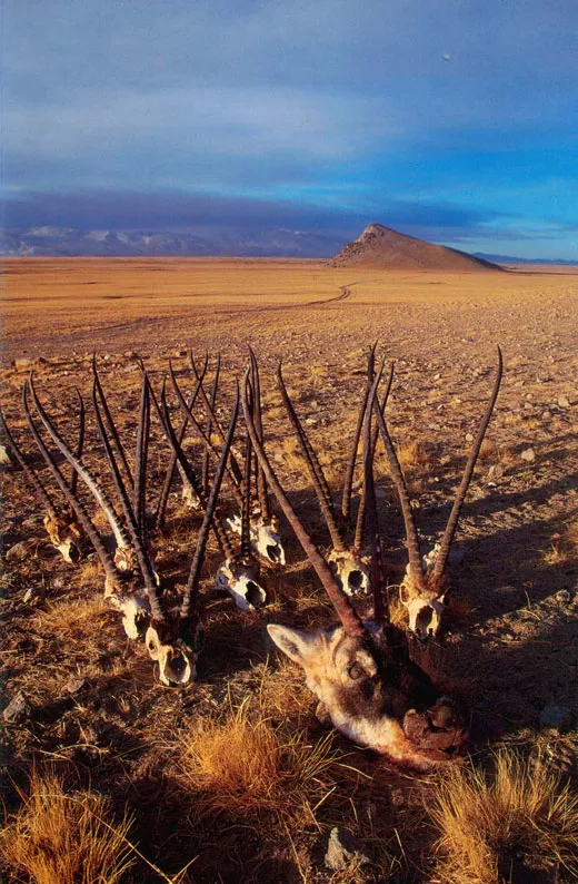 然而短短的三个月后, 奚志农却在格尔木 看到了藏羚羊堆成小山的头颅和皮子。 他真真切切地看到了 藏羚羊至死还圆瞪着的眼睛、 角上的弹洞以及滴血的头颅……
