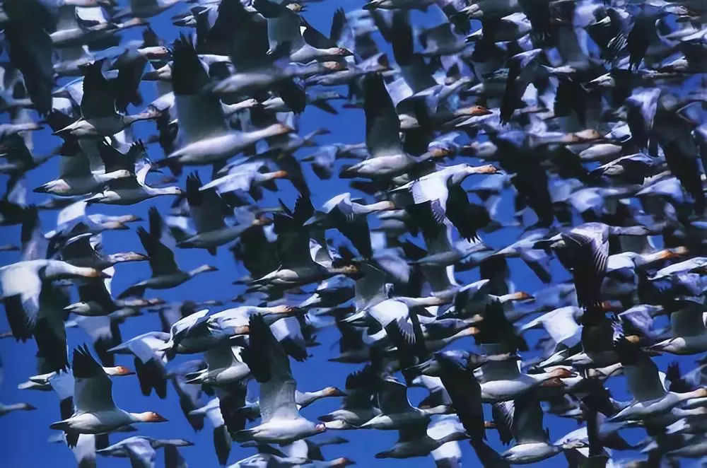 拍到了正在返回东西伯利亚繁殖的雪雁, 那种中国稀有的冬候鸟, 遮天蔽日地飞翔。