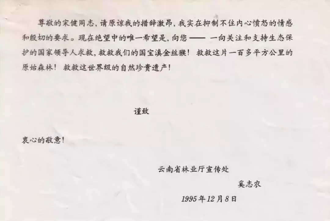 为了阻止这项商业砍伐计划,奚志农带着他3年来拍摄的影像四处奔走,写信写到了当时的国务委员宋健。