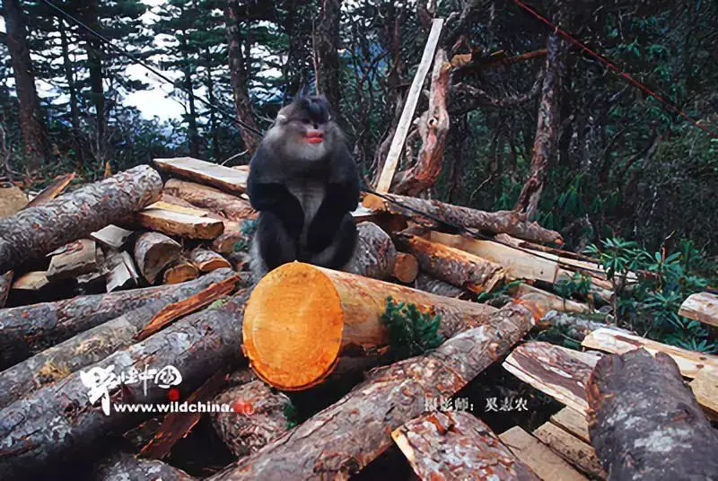 坐在伐木堆上的滇金丝猴,摄影:奚志农