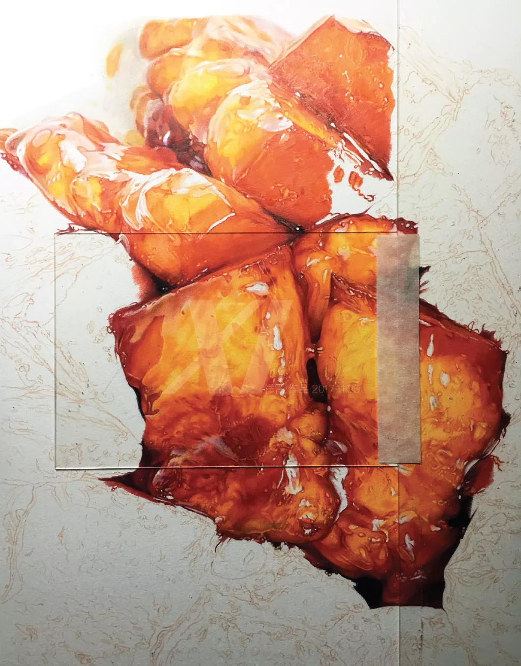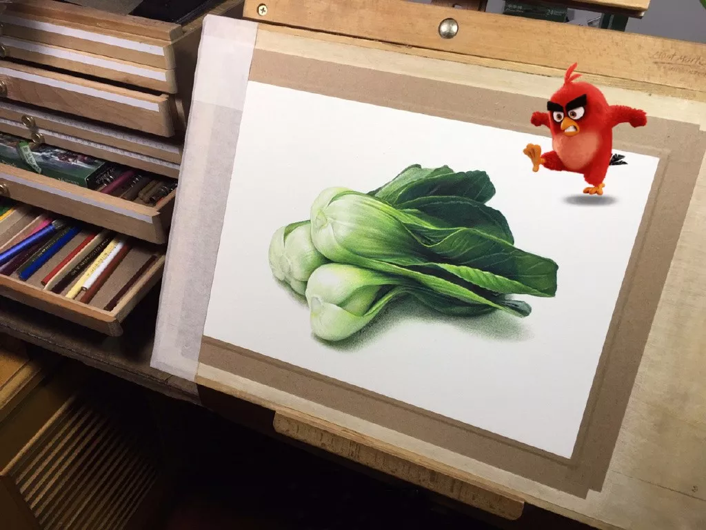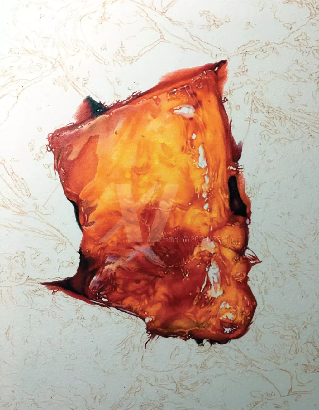 但实际上, 他的画作虽有一定的真实感, 而一旦将作品放大, 会清晰看见铅笔的笔触和水彩的痕迹, 笔触随性但不随便。