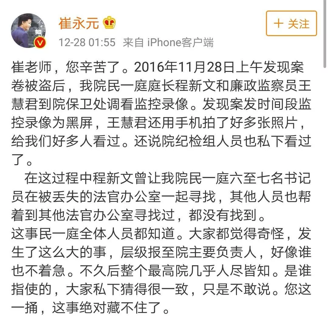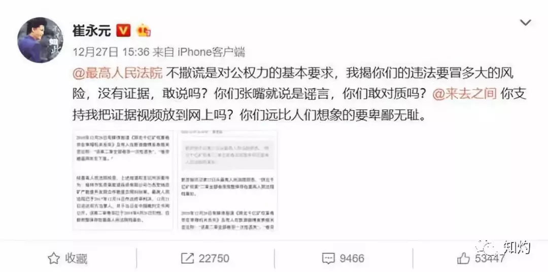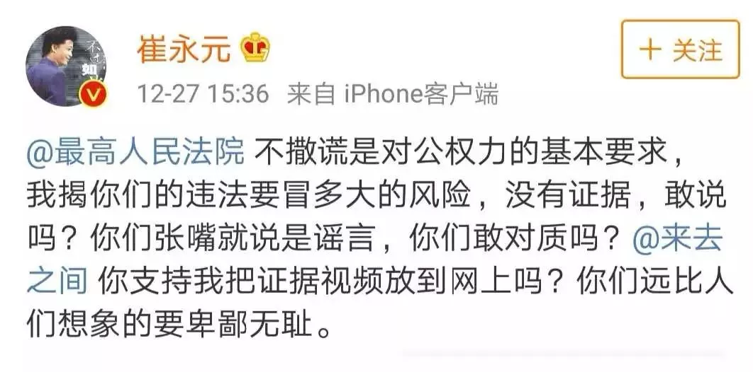 因为陕西千亿矿权案,12月26日晚上的时候,崔永元发微博怒怼最高法院,怼的是最高法院曾经丢失过这个案件的卷宗这件事,老崔用词依然非常的流氓,甚至用了“*你妈的”这样直抒胸臆的词汇,对于事实的描述,崔永元用了这样一句话,从省长到院长勾结在一起耍尽花招……