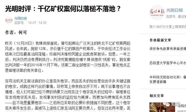 对于该事件,27日,光明日报——光明时评发表评论《千亿矿权案何以落槌不落地?》指出:在司法机关主审法官的办公室丢失卷宗,而且丢失的恰恰是包含许多关键证据的卷宗,成就这样巧合的事情,非劳驾上帝亲自出手不可。