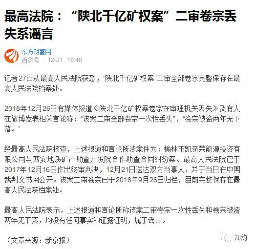 事件发酵后,最高法院作出回应。报道显示,经最高法核查,上述报道和言论所涉案件为:榆林市凯奇莱能源投资有限公司(下称“凯奇莱公司”)与西安地质矿产勘查开发院(下称“西勘院”)合作勘查合同纠纷案。最高法院已于2017年12月16日作出终审判决,12月21日送达双方当事人,并于当日在中国裁判文书网公开。该案二审卷宗已于2018年9月26日归档,目前完整保存在最高人民法院档案处。最高法院强调,上述报道和言论所称该案二审卷宗一次性丢失和卷宗被盗两年无下落,均没有任何事实和证据证明,属于谣言。