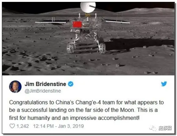 就连NASA局长Jim Bridenstine在推特上发文表示祝贺,并称这是人类首次(在月球背面着陆),成就令人印象深刻。
