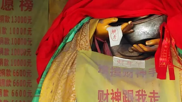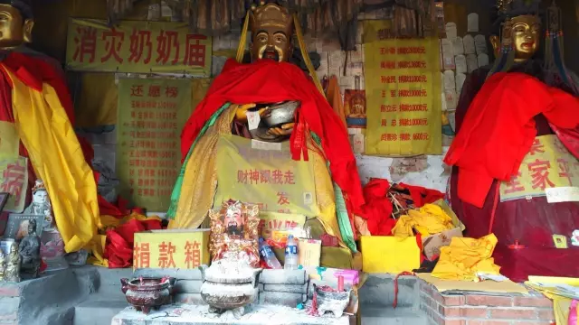 但是奶奶庙最有意思的地方在哪呢?是它的文字标识系统。这是一个财神庙,大殿旁边的财神庙。这有一个神手,摸摸财神手,财神跟我走。