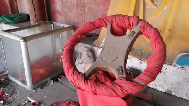 大家都明白这什么意思了吧?车神。这个车神眼睛目不转睛地盯着前方,我觉得插个安全带可能会更好一点。能把宗教的复杂含义表达得如此地一目了然,其实是很不简单的。 我当年去了两次西藏,每次去都特别痛苦。因为我看不懂它里面的壁画,那些复杂的宗派,完全看不明白。就会觉得很无力,觉得自己很没水平、很没文化,在那些壁画面前自己是很自卑的。可是看到这个之后会发现:哎,他说的意思我懂。 这是中殿的一个车神。这个车神手上没拿东西,但是它前面供了一个大巴车神:公交车的方向盘。