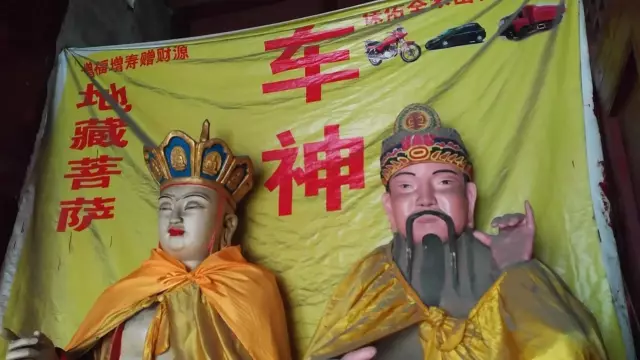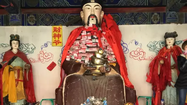 既然它有这么大的人流量和人气,那肯定会有一些很独特的地方。这个寺庙最大的一点不同在于它是一个个人承包制的,山下的马头村在经营这个庙。也就是说只要你能出钱,就可以承包一个前殿、正殿,或者财神殿,一年交租金。然后你自己就去布置里面的佛像和壁画。 在传统的寺庙当中,我们是根据宗教的礼仪、宗教的仪式来安排一个序列。先进山门,看到一个弥勒佛。完了之后去大殿又看到什么,侧边有什么东西。这里是不讲这些的,这是一个宗教文化线下体验商业步行街。 就是这么一个地方,正因为它是一个做生意的地方,每家每户就想着怎样才能吸引更多的游客来。这跟开个店怎么打广告,怎么吸引顾客是一样的。他们很聪明地根据现实的需要,对宗教做了大胆的改革。 这个官神、车神、学神,以前基本上都没有。