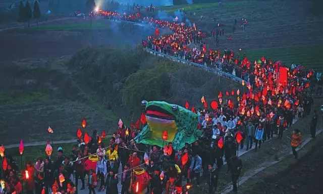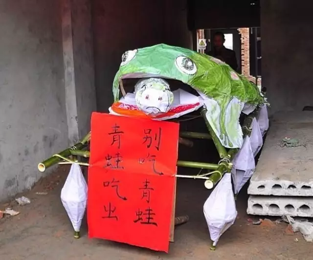 每年的正月十四他们就做一个纸蛤蟆,然后把这蛤蟆抬出村庄。人民手上会拿一个小灯,这个小灯也是一个小蛤蟆。但没做成蛤蟆的样子,因为太复杂,所以就给它们贴了一个蛤蟆的标签,最后他们会把这个东西放在那个顶上。