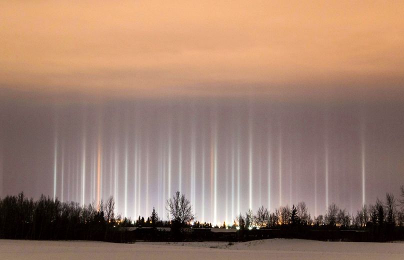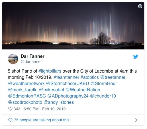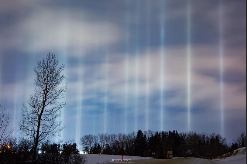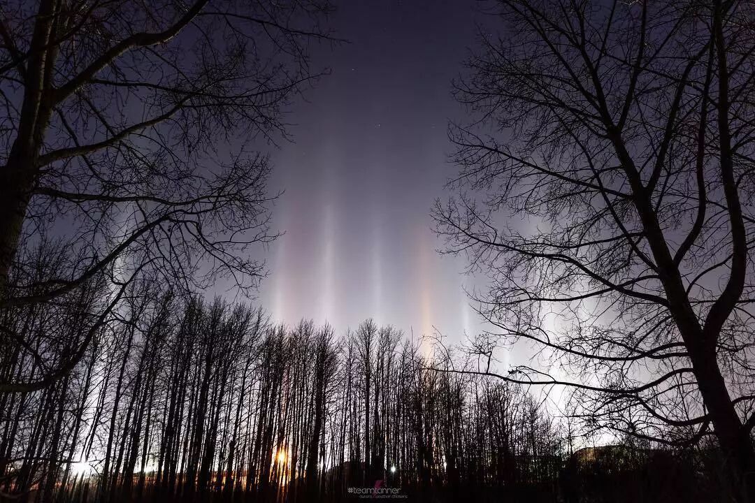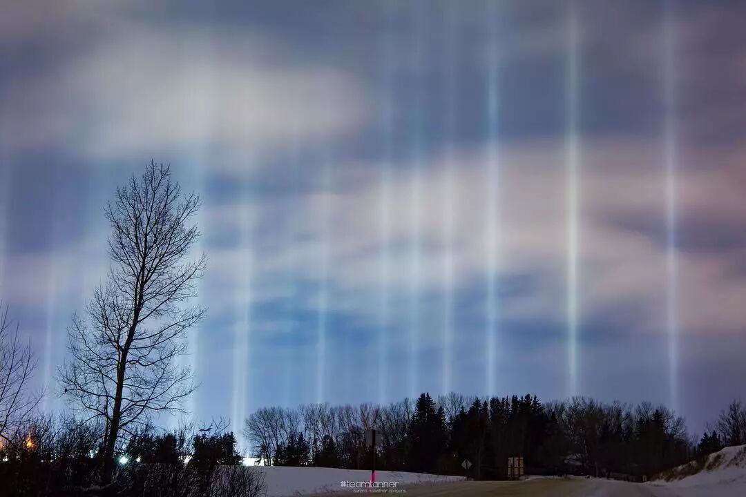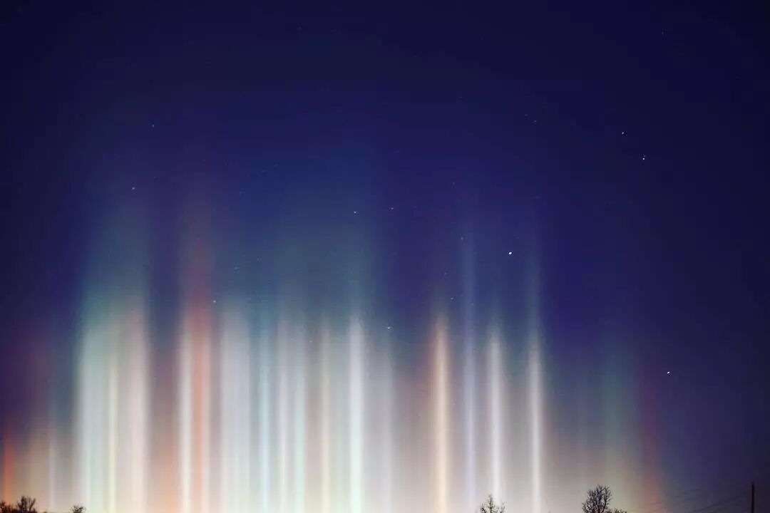 但是在某些地方 一场神奇的视觉盛宴正悄然上演。。 据“天气网”报道, 阿省各地天空先后出现一种神奇的光柱