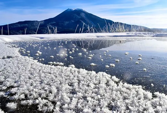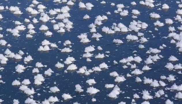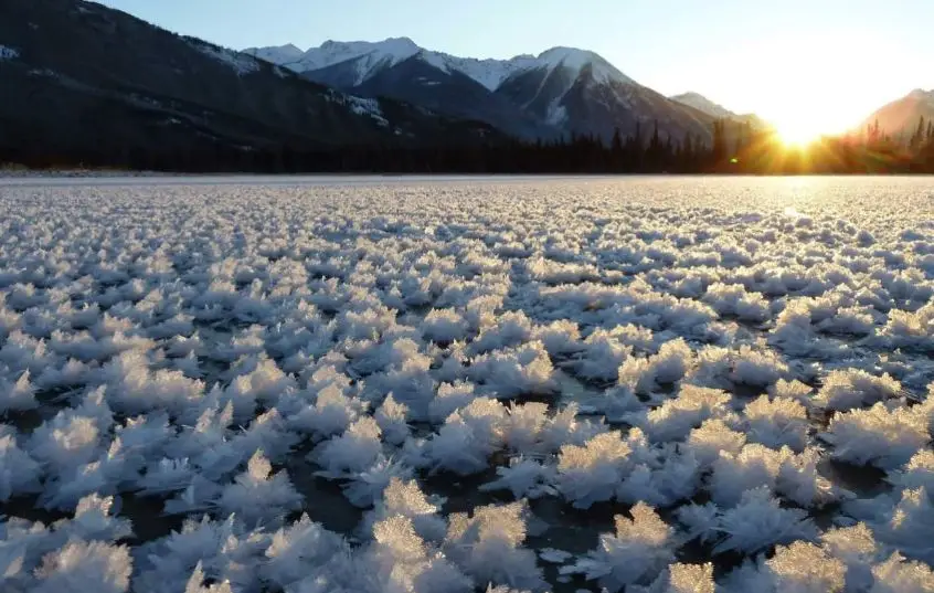 这种现象叫做“霜花”(Frost Flowers),通常在-22℃极其寒冷时出现在初成的海冰或者薄薄的湖冰上。