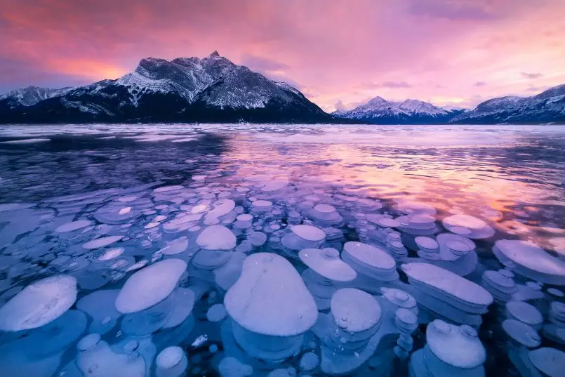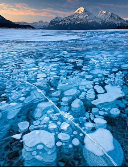 冰湖气泡(Frozen lake bubbles) 自从Paul Zizka的一组照片震撼了世界,每年都有无数摄影师和游客蜂拥而至,一睹加拿大冬日奇观。