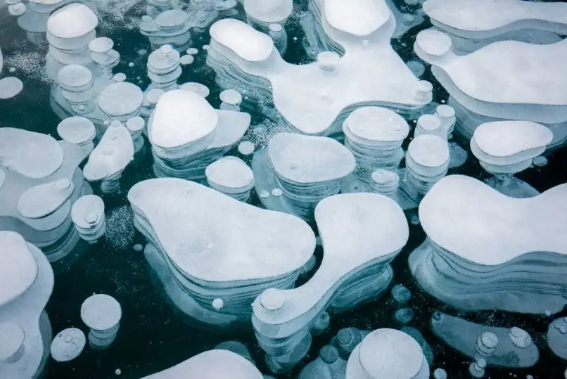 冰湖气泡实际上是湖底腐烂有机物产生出的甲烷气体;极寒天气下湖水温度足够低,就会把甲烷气体冻结在冰层里,形成冰湖气泡奇景。