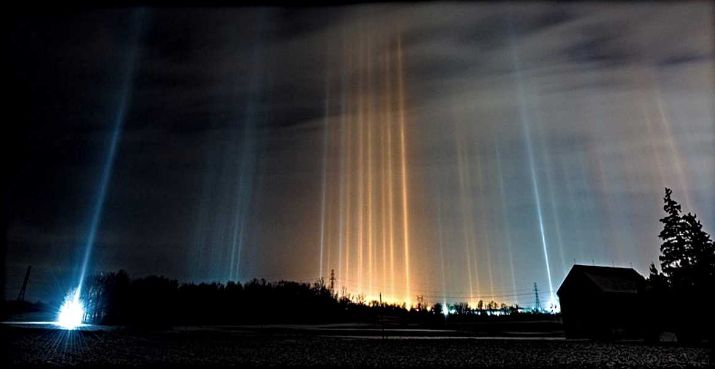 这些垂直光束是通过光学错觉形成的, 当微小的冰晶悬浮在地面附近的空气中时, 冰晶的边缘就如镜子般反射各种光线, 包括阳光,月光或城市的灯光。