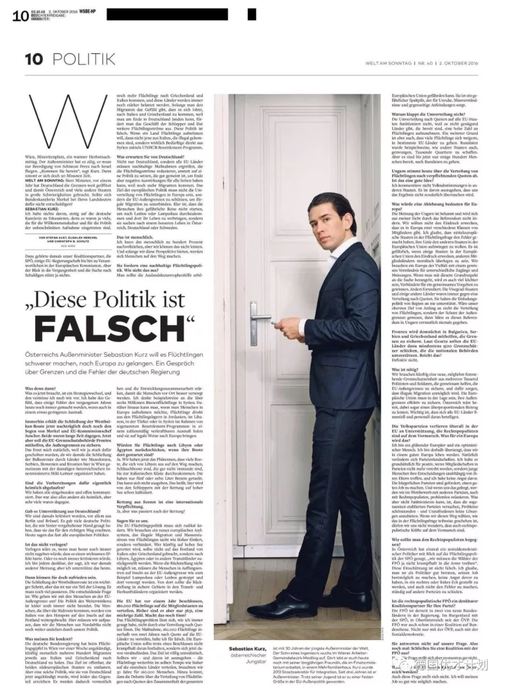 他还一改人民党以往的中间派路线, 与自由党合作,设定难民人数上限, 支持取消穆斯林在奥的学校, 并首次在刑事法院,医院和养老院, 大大限定了穆斯林的权力, 还亲自去检查, 每一条难民涌入奥地利的主要通道, 要求马上关闭, 把中东难民彻底拦在国境线上, 以强硬手腕给全体奥地利人民, 一个满意的答案。