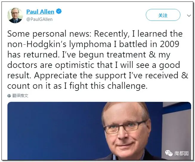 所以后来很多编程者都在质疑DOS最初到底是谁开发的 为此也打了很多的口水仗,但是毫无疑问,DOS在保罗的手上发扬光大 微软也彻底成为了世界顶级的软件公司,这是1981年的事情 而1982年他却意外发现自己患上了淋巴癌,全名叫霍金奇淋巴瘤 这个病挺严重的,一般来说当时大部分的人会处于等死的状态 他却完全不管,一边处理微软的事情,一边和医生说 “别怕,别管什么副作用,有什么新疗法全部给我上,我就不信了!”