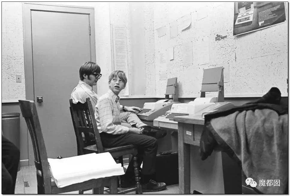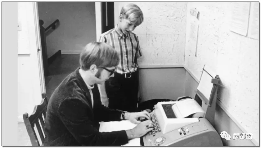 看到没有?带着眼镜在操作的就是保罗 站在旁边安静看着大哥哥操作的就是年幼的比尔盖茨了 是不是很萌?我们都说比尔盖茨是天才 但是其实保罗的天赋比盖茨还牛 他们操作的这台机器叫做TELETYPE,不是最原始的电脑哦 怎么解释呢……应该就是一台商业电传打字机 功能就是最原始版的纸质微信、QQ等,可以即时打字传过去 别笑,在没有电脑的时代,这可是很厉害的东西