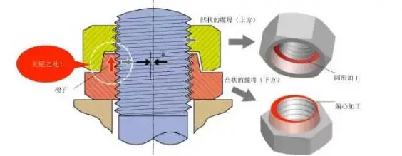他想到的方法,是在一个螺丝钉上使用呈“凹”“凸”形状的两种螺母。下方呈凸状的螺母,在加工时中心稍许错动(偏心加工),起到楔子的作用。上方呈凹状的螺母,则不作偏离中心的加工(圆形加工),于是形成了锤子揳打楔子的功能。(图2)这样的两个螺母合二为一,松动问题就迎刃而解了。