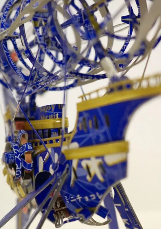 这艘飞船十分精巧, 每根缆绳细如发丝, 上面的船舱、窗户也未曾遗漏细节。 还记得吗? 它们本来都是我们平时吃零食, 随手扔掉的盒子。