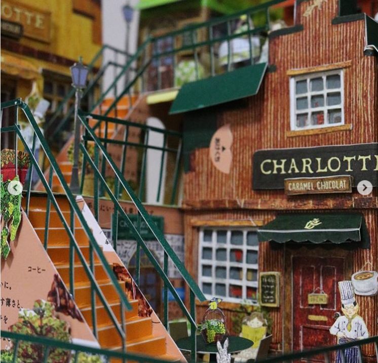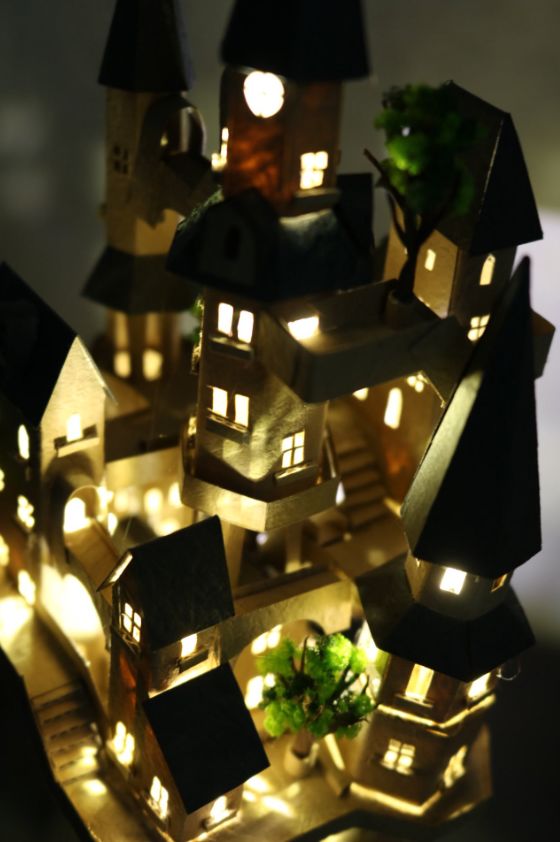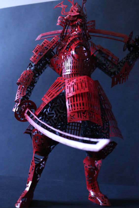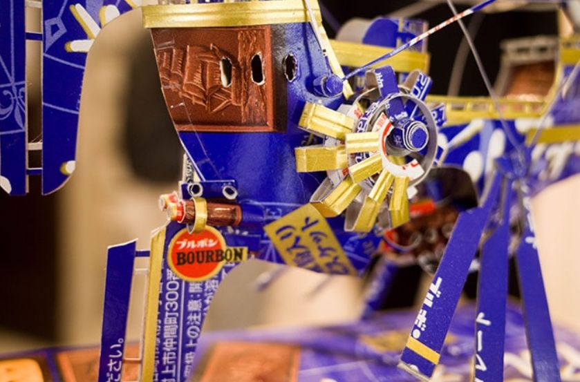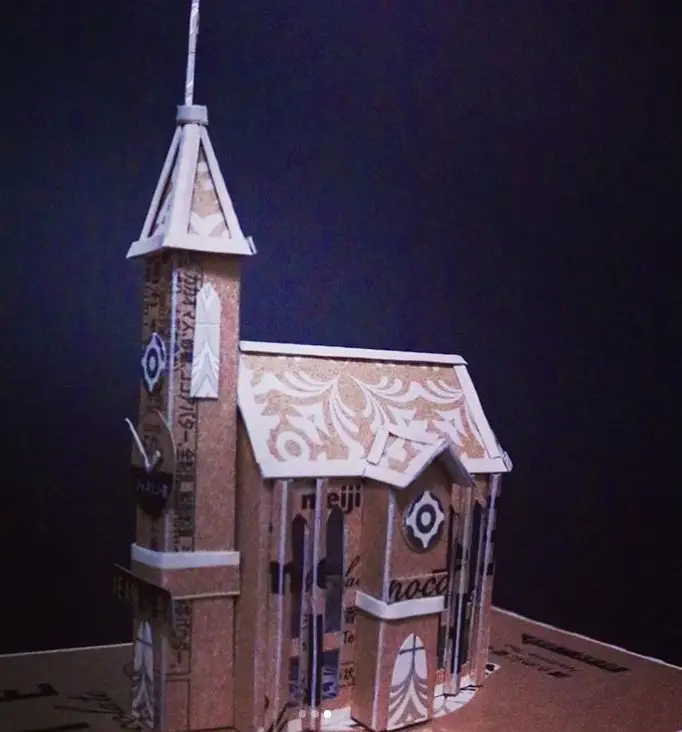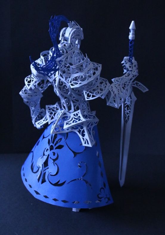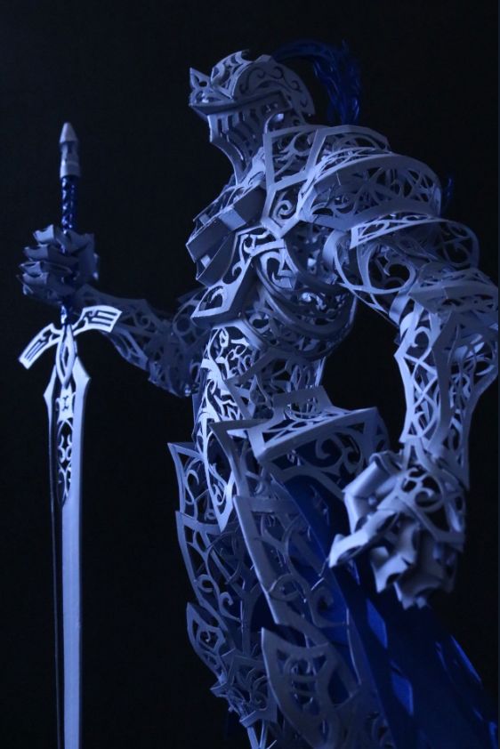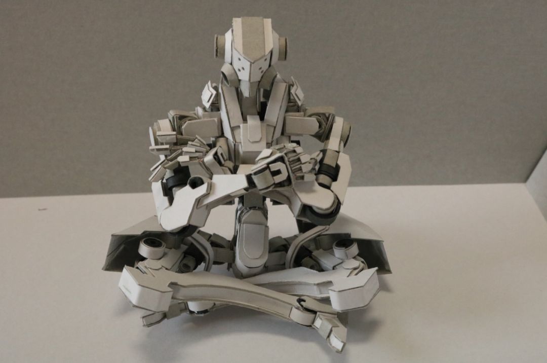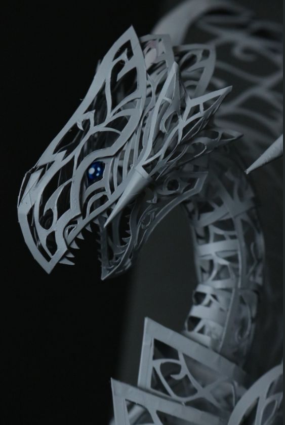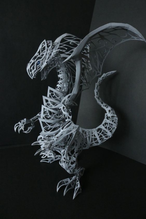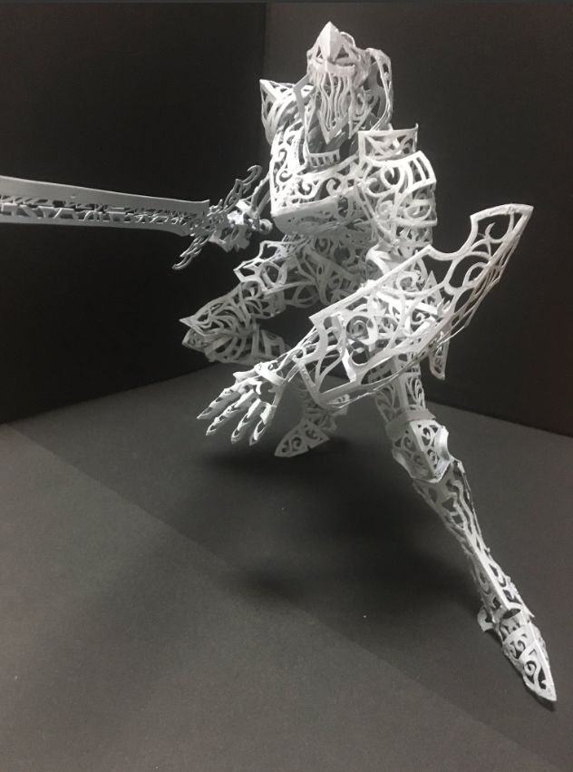 除了这些繁复华丽的花纹, 他作品中最让人佩服的, 是将纸质作品, 生生变成了组装模型。 一个部件是由许多零件组合起来, 因此还能摆出各种造型。