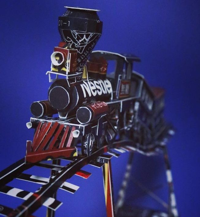 他的精细最能体现在交通工具上, 每个零部件都没有落下。 比如这辆火车, 是用雀巢咖啡的盒子做的, 从排障器到车轮间的轴承, 全部都还原了出来。