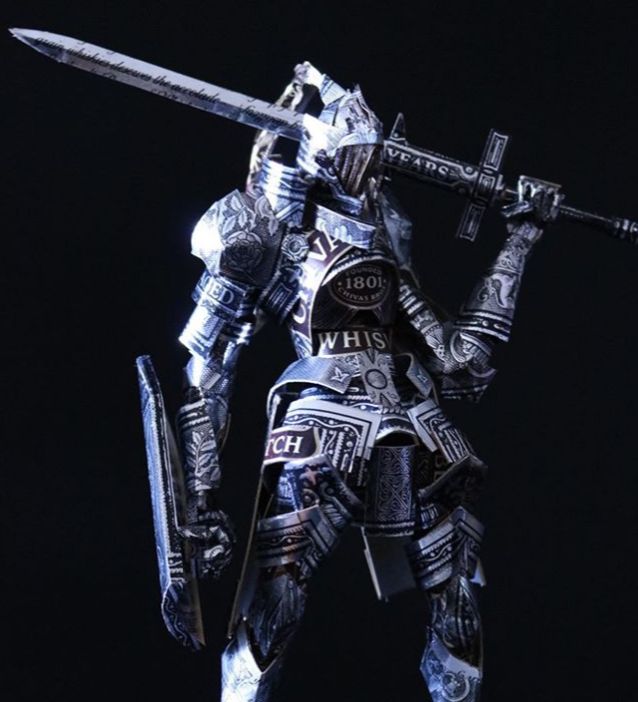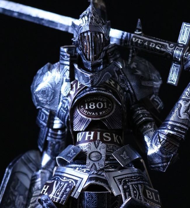 凹凸有致的盔甲纹路, 你相信是纸盒做的吗? 它不但是纸盒做的, 而且没有后期上色勾勒, 所有部分都是盒子本来的花纹。 看看这个盒子的模样就知道了。