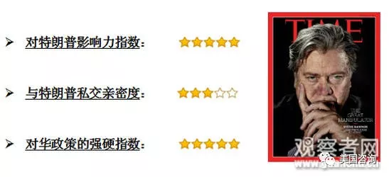 班农:白宫前首席策略师——一个为班农量身定做的新职位,无需参议院认证,位列重要阁员之中,甚至被特殊允许参加国安会;特朗普胜选的最大功臣,主导特朗普对华思想和政策的灵魂人物;曾任美国极右翼“经济民族主义”大本营Breitbart News Network的总裁。虽离开白宫近一年,但仍通过各种渠道与特朗普保持密切联系,并正为特朗普2020年大选筹划准备; 65岁。