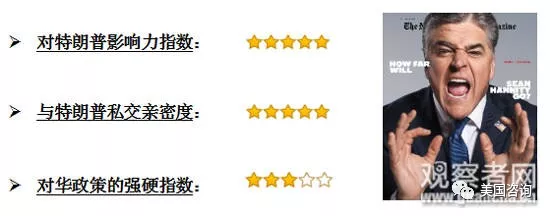 汉尼提:福克斯电视网明星主持,特朗普挚友和最坚定的政策支持者及宣传者;美国现在收视率最高的电视评论节目和收音机脱口秀节目主持人,每周固定听众超过1300万人;特朗普经常收看汉尼提的电视评论节目,接受其专访超过60次;每周与汉尼提通话数次,二人私交甚密;57岁。