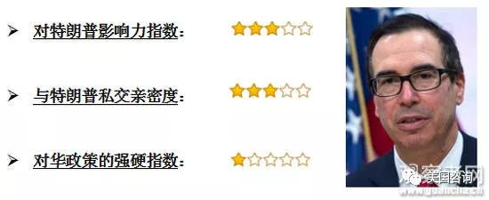 姆努钦:美国财政部长,任职高盛投资17年,曾担任首席信息官;金融投资家,特朗普竞选时的重要团队成员,负责金融、财务政策领域,力挺减税法案,并最终亲自促成美国历史上最大规模的税改方案获得通过;十大高参中唯一的对华鸽派或者温和派,主张以谈判解决问题;从2004年起,其创立的投资基金与特朗普有商业地产上的合作,并投资了包括《阿凡达》在内的数十部电影,现夫人为好莱坞影星;56岁。