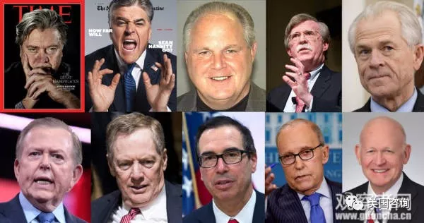 史蒂夫·班农(Steve Bannon)、汉尼提(Sean Hannity)、 林堡(Rush Limbaugh)、 博尔顿(John Bolton) 、纳瓦罗(Peter Navarro) 、鲁·道博(Lou Dobbs)、 莱特希泽(Robert Lighthizer) 、姆努钦(Steve Mnuchin) 、库德洛(Larry Kodlow) 、白邦瑞(Michael Pillsbury) ,以上十人是特朗普对华政策从酝酿到成型不可或缺的核心圈子成员。(另有三位候选替补,分别为:白宫国安会亚洲事务主任Matthew Pottinger 、美国国防部长James Mattis、美国国务卿Mike Pompeo。)