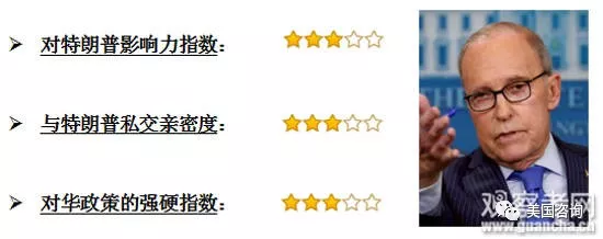 库德洛:现任白宫经济委员会主任;前华尔街投资分析师和投资专家,里根政府时期任职经济与预算部门的副主管,支持里根的减税和放松政府管控的政策;美国最大经济新闻电视网CNBC的著名主持人。特朗普经济政策的坚定支持者,主张对华强硬,但相对理性和老谋深算;71岁。