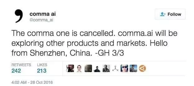 他开始认真研究自动驾驶技术,还正儿八经地成立了一个公司,Comma One。
