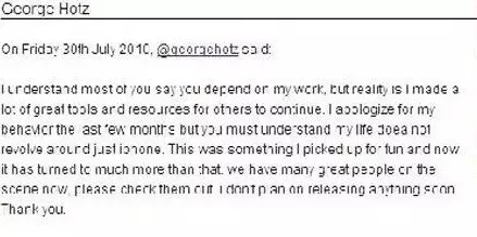 Geohot究竟违法了没?企业方觉得随意“越狱”会助长盗版之风,而Geohot的逻辑是:“我既然掏钱买了手机,就有权对它做任何事,包括告诉其他人怎么解锁它,信息本来就应该是自由的,问题是这种自由是应该掌握在少数人手里,还是多数人手里。” 直到2010年,Geohot发布了一则声明,宣布不再破解Iphone: “我知道你们很多人很依赖我的工作,但我的生活不可能只绕着Iphone转,这只是我的一个爱好,现在我需要去做更多的事情,短期内我不打算发布任何东西。谢谢你们。”