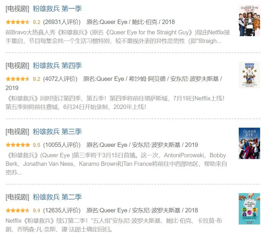 拍了四季的《粉雄救兵》,每一季在豆瓣上都口碑不俗。