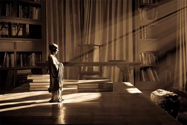 阳光洒进书房,在造型素简的平头案和四出头官帽椅上落下点点余辉;古堡书案上,静静地立着明代的罗汉……