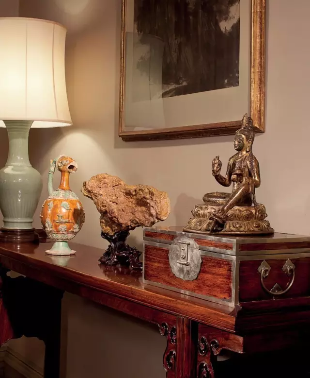 另外,西汉时期的鎏金铜熊造像,被置于公寓中乔治二世时期的红木几案之上。这是安思远极为珍惜的一件藏品,他常常边与客聊天,边不时抚摸。一件15世纪西藏“大成就者”坐像置于其卧室之中。每日相伴,据说他常与之倾诉,恍如挚友。