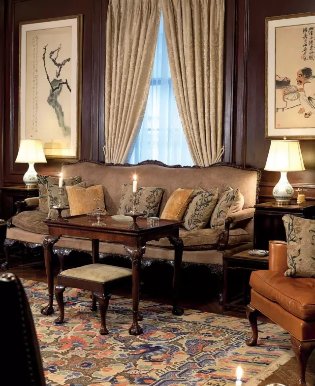安思远善于组合不同文化、年代、风格的家具,以书房为例,他知道访客会从前厅进入书房,和坐在书桌前、背对窗户的他会面,就特别安排让访客首先窥见一对扶手椅的背面。因而,他特别注意椅背的修饰和椅脚的独特美态。