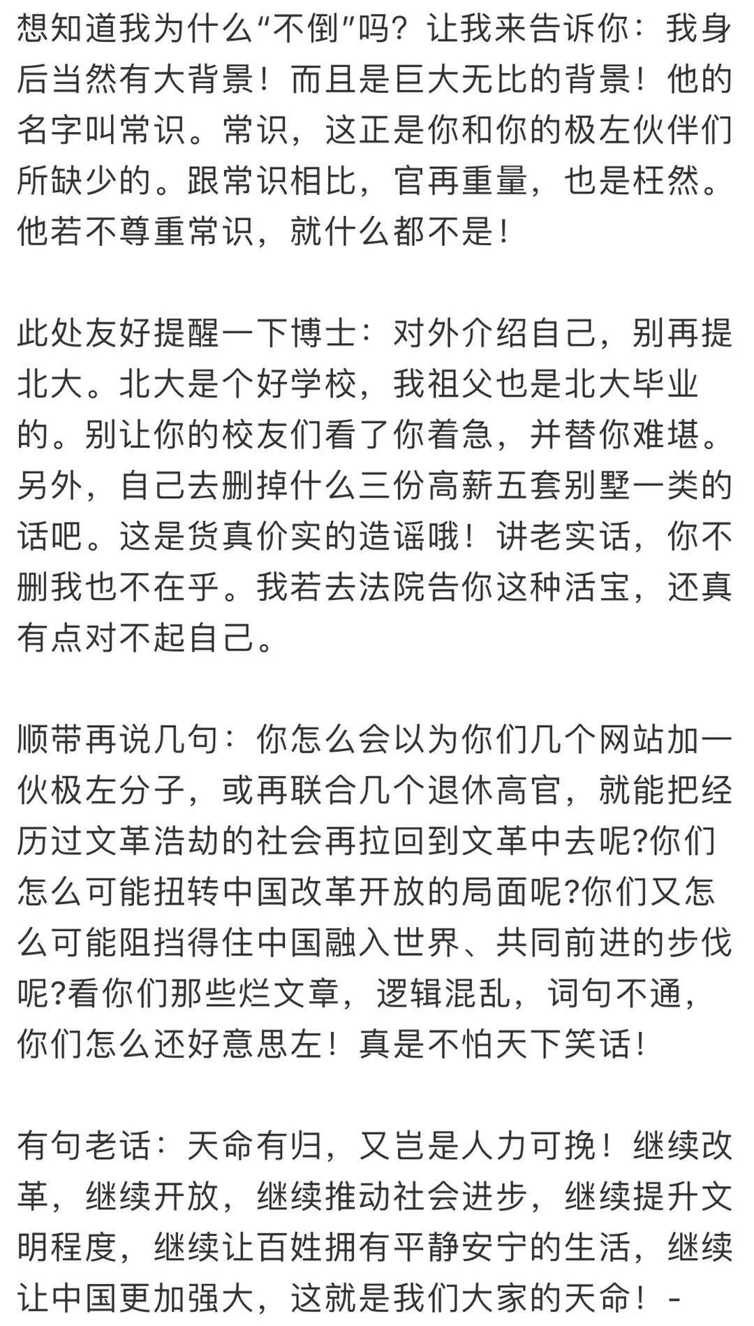 今天就到这里。我还要重复一句:极左就是中国祸国殃民式的存在。改革开放如果毁在了这些人手里,是我们这代人的耻辱。来吧,把你们所有的招数都拿出来,把你们背后的大牌都喊出来。你看我怕不怕你们!