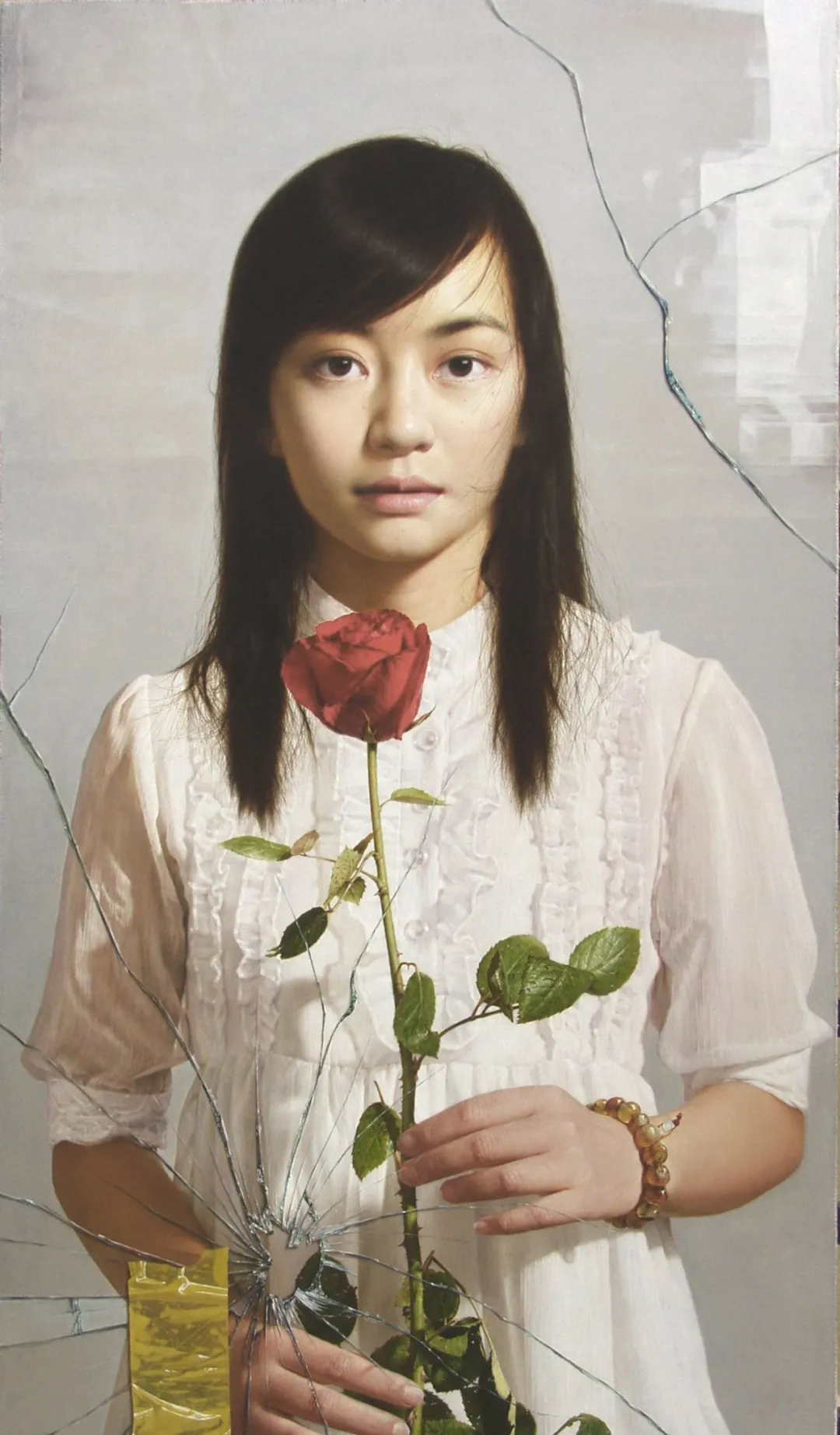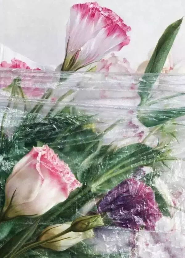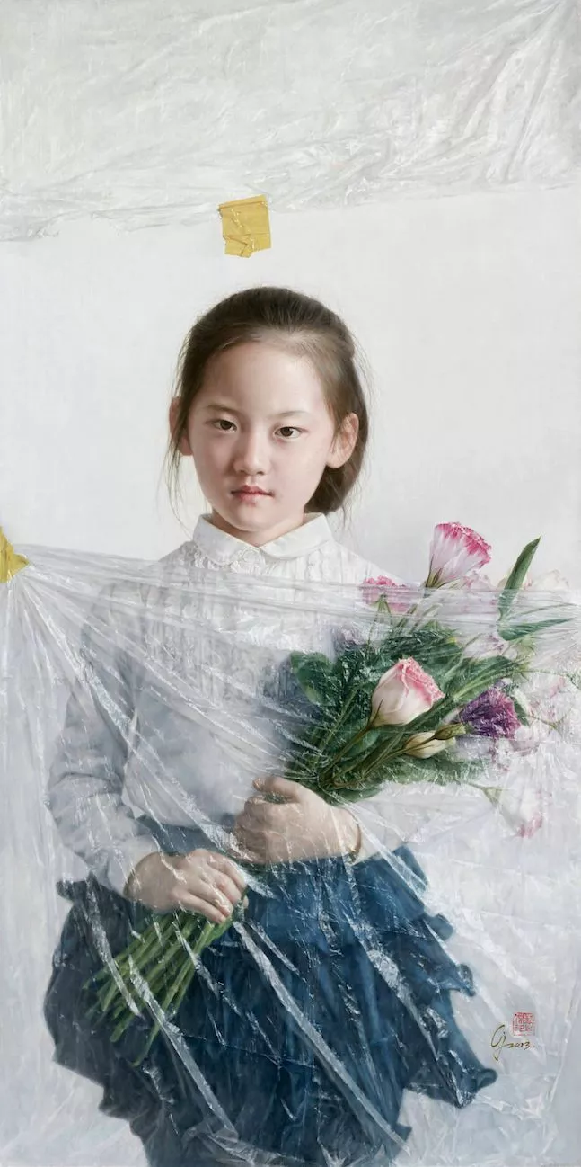 和蔡杰以往的作品一样, 这幅带有强烈的超现实主义的风格, 塑料薄膜强烈的质感和透明度, 使得作品惟妙惟肖, 手中的花儿和女孩儿的脸庞, 使得画面有一种安宁的祥和。