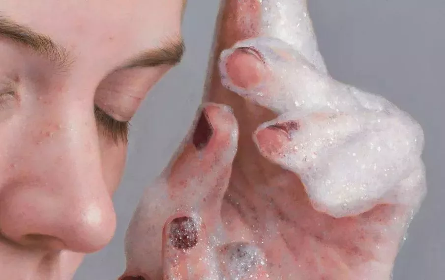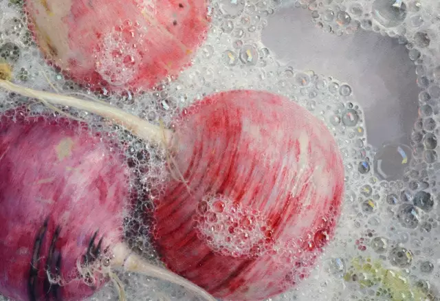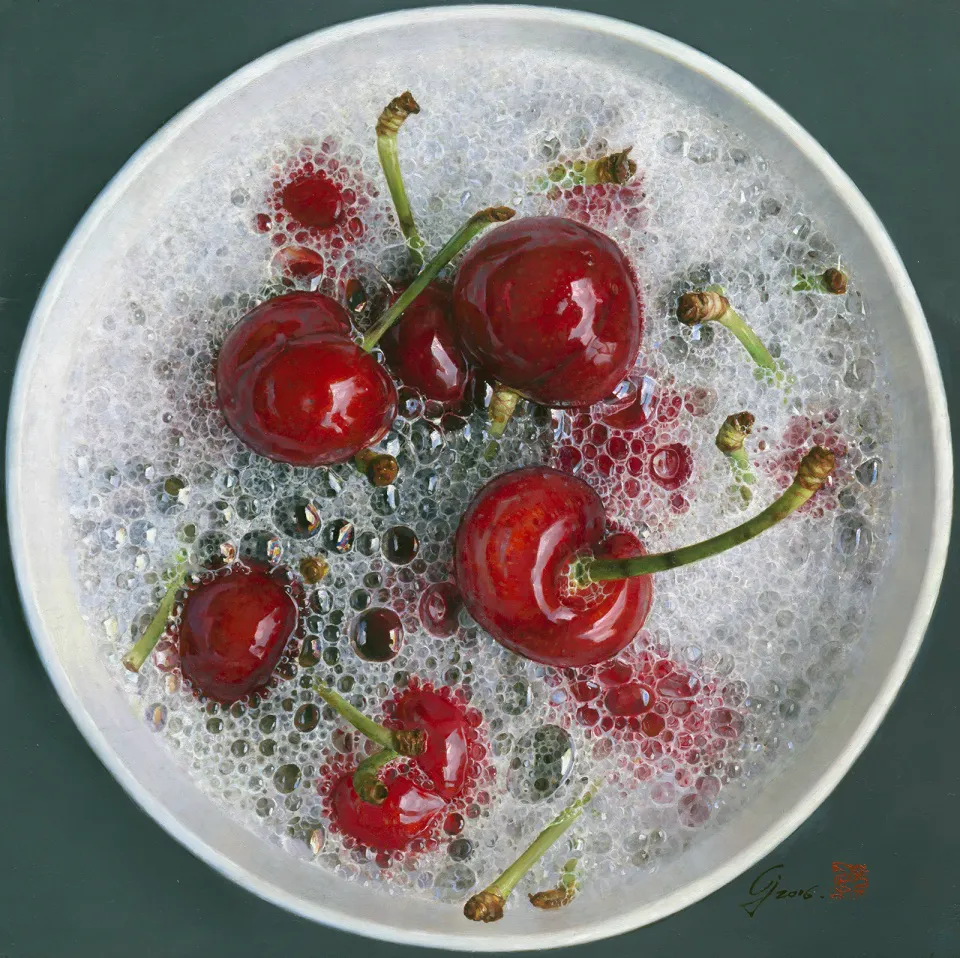 是因为蔡杰在画之前, 都会反复洗樱桃, 在洗的过程中观察泡沫和樱桃的形态,