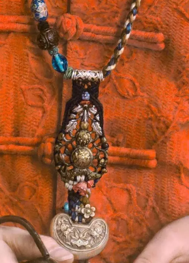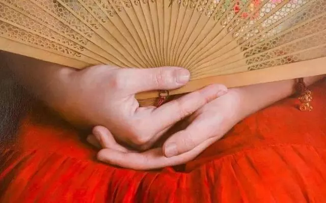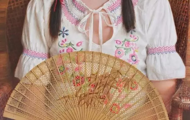 就可以细细地把心事诉说。 再仔细看细节图: 手部的姿势,扇子的图案, 衣服上的刺绣,