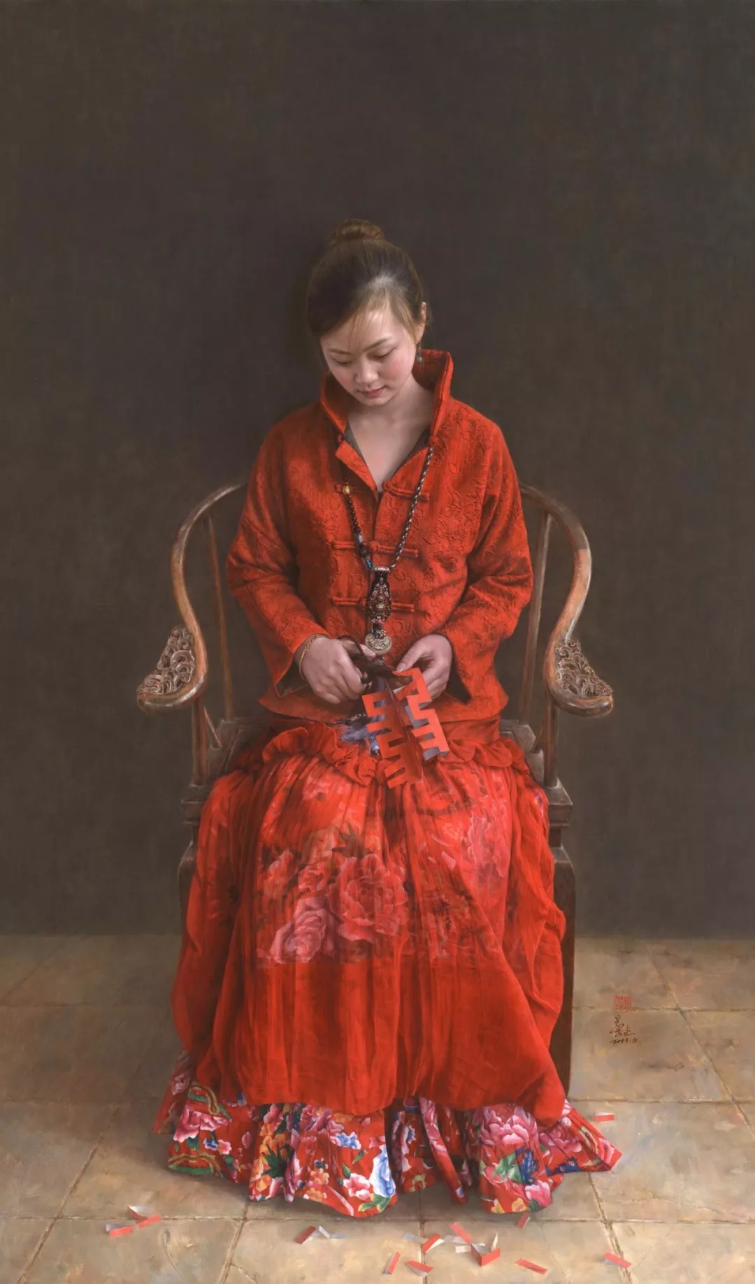 《喜》102x165cm 2011 比如《喜》的创作过程, 蔡杰几乎是一气呵成, 改动很少, 人物姿势与神态在素描阶段,