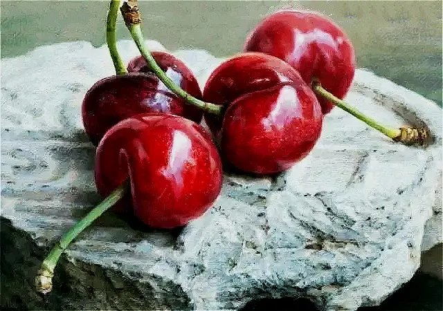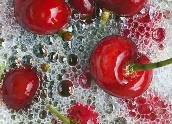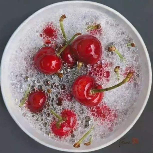 放大五倍后, 不仅找不到丝毫的绘画痕迹, 而且4个樱桃的细节还更加清晰。 光线和色泽, 真实反映了樱桃的形态, 饱满的感觉, 让人觉得咬一口就爆汁!