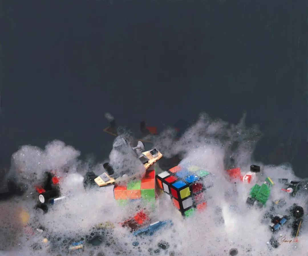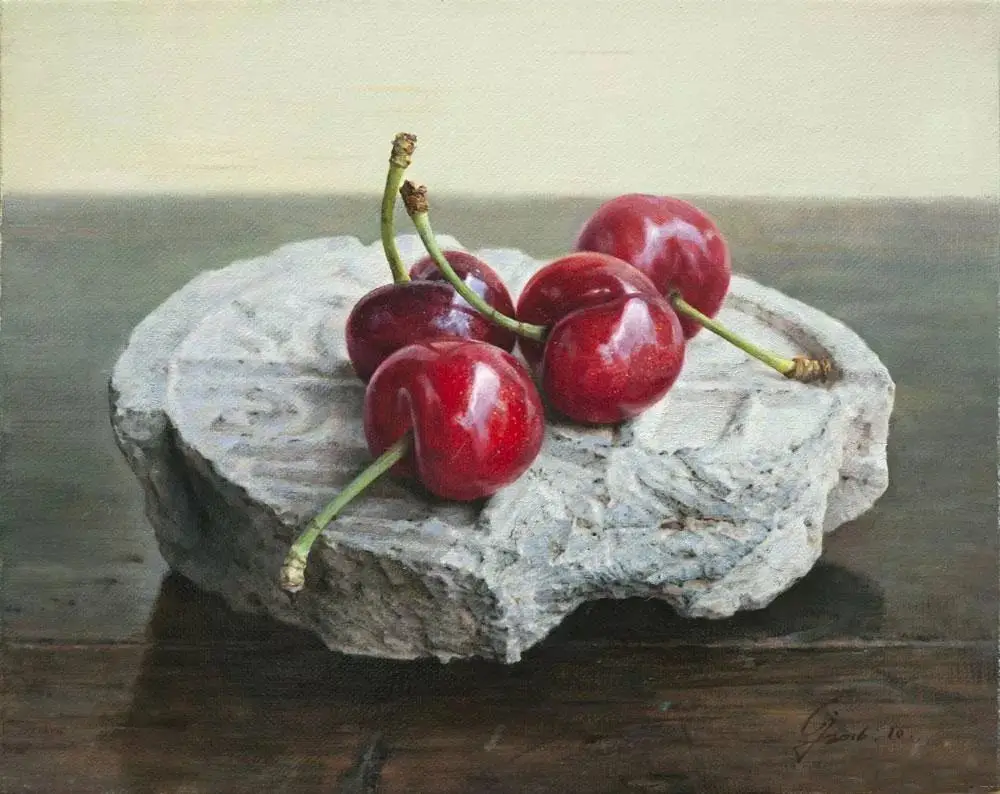 成为了蔡杰超现实主义画风的, 主要构成来源。 意大利FAC国际当代艺术展的 评委们评价他: “蔡杰创建了一个虚假的现实, 是一个令人信服的幻想。” 不过蔡杰最出名的, 不是《花语》, 而是这幅《四颗樱桃》。 你能想象吗? 这四颗樱桃,价值19万。 《四颗樱桃》 ▽
