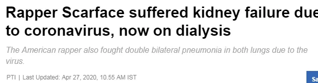 美国传奇说唱歌手Scarface在感染后,身体逐渐恢复,症状都已消失,唯独肾衰竭的情况在不断恶化。