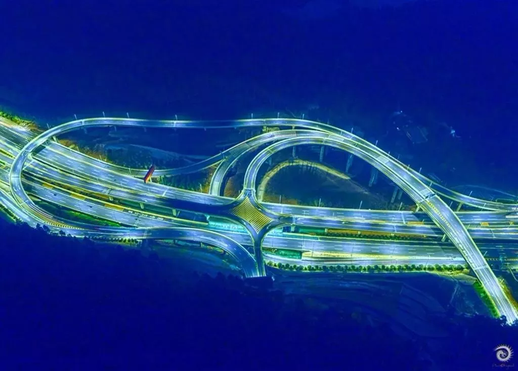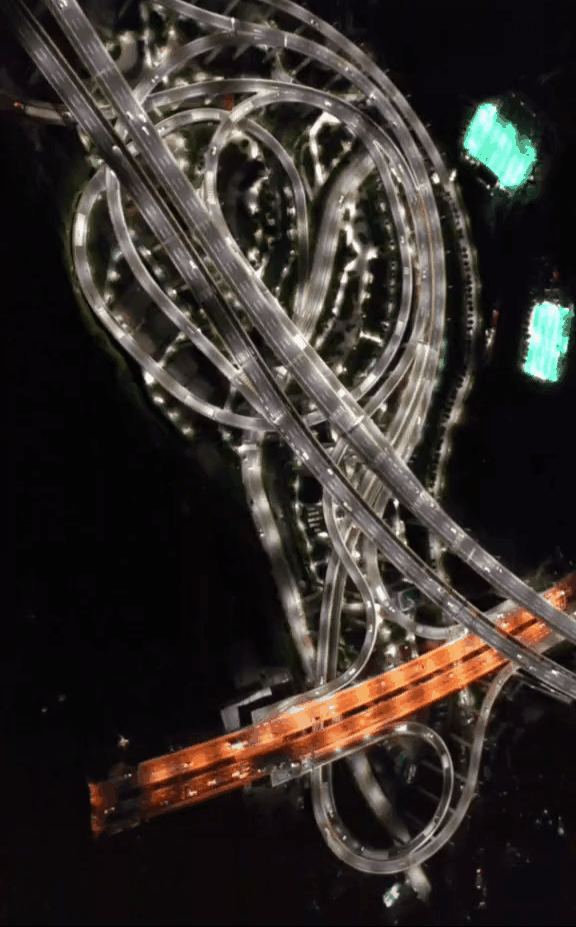 . 5层立体交叉, 11条匝道、8个出入口, 最大垂直落差为55米(相当于18层楼高)…